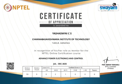 Faculty Yashaswini CS got NPTEL Mentor Certificate from IIT, Madras for mentoring the students for the course advanced power electronics .